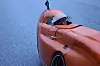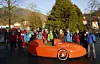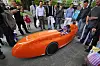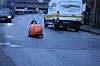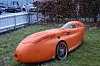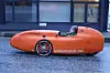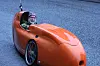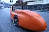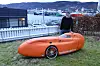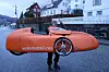Under det aerodynamiske oransje skallet til den såkalte "velomobilen" finner man pedaler og styrespaker. I liggende stilling overtar Løberg ofte ivrige syklister.