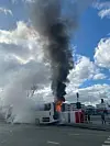 Røykedykkere fra brannvesenet er på vei inn i bussen.