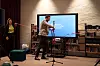 På scenen lot hun barna være med på den interaktive bildeboken Trykk her av Herve Tullet. Barna måtte trykke, blåse og riste for å drive historien videre. De løp ivrig opp én etter én.